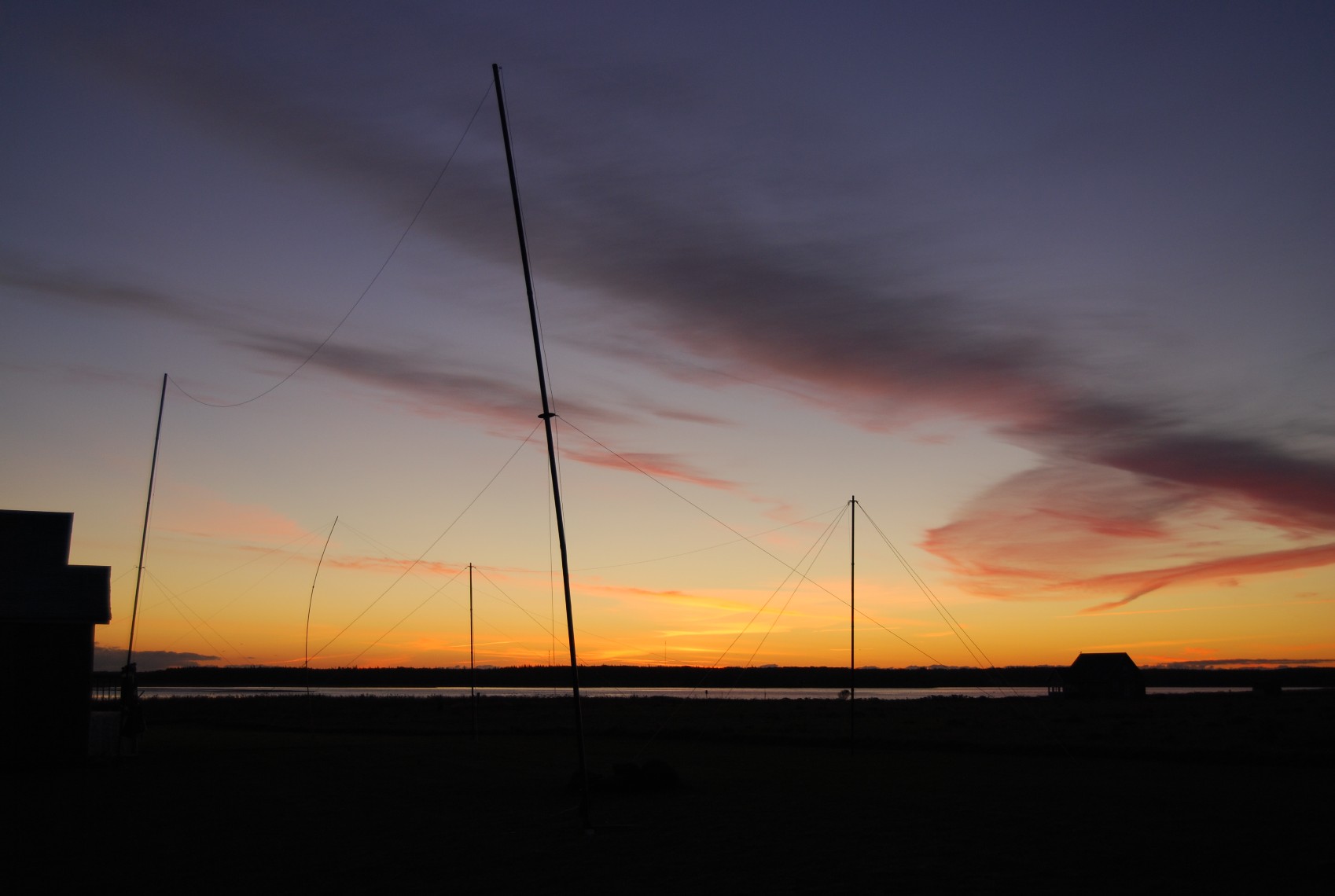 The cottage and antennas at sunrise. Terminated broadband loops were the antennas of choice; two SuperLoop antennas and a Delta.