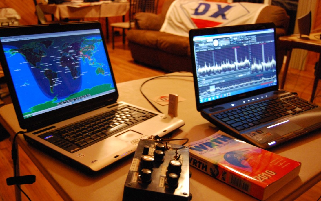 Bruce Conti prepares for DXing as Saudi Arabia produces audio well before sunset, using one computer to operate the Excalibur SDR and the other for wireless online access.