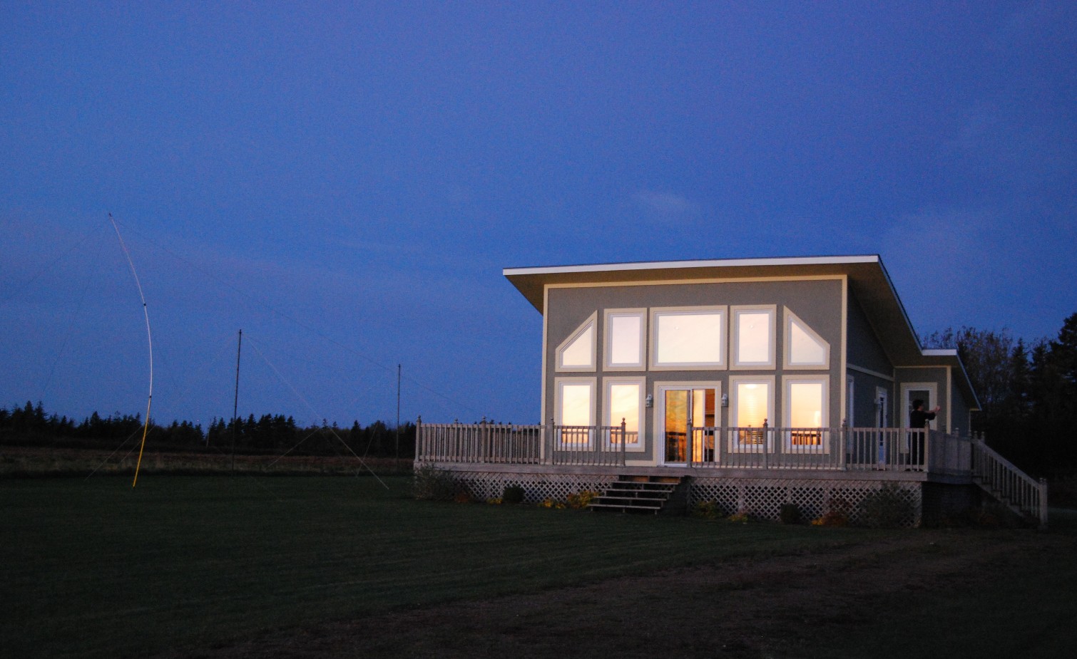 The cottage and antennas at sunrise. Terminated broadband loops were the antennas of choice; two SuperLoop antennas and a Delta.