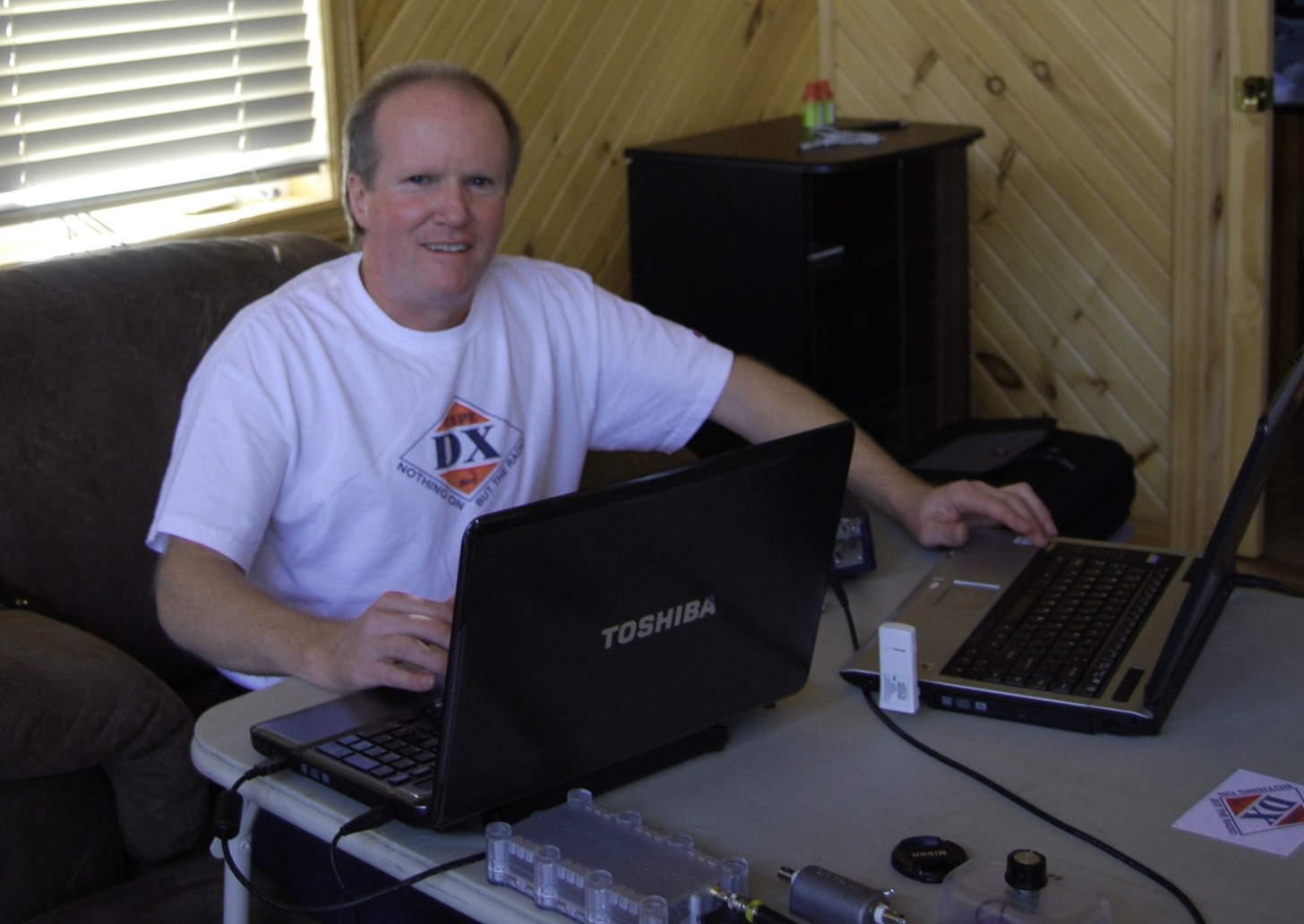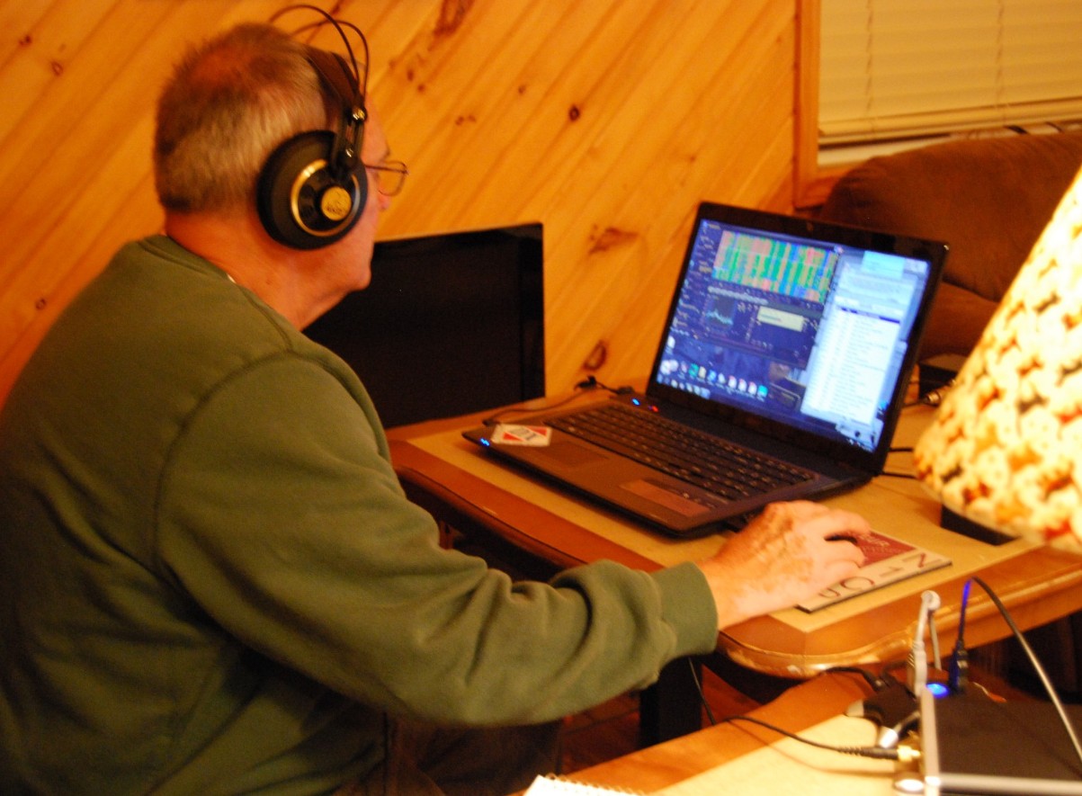 Bruce Conti prepares for DXing as Saudi Arabia produces audio well before sunset, using one computer to operate the Excalibur SDR and the other for wireless online access.
