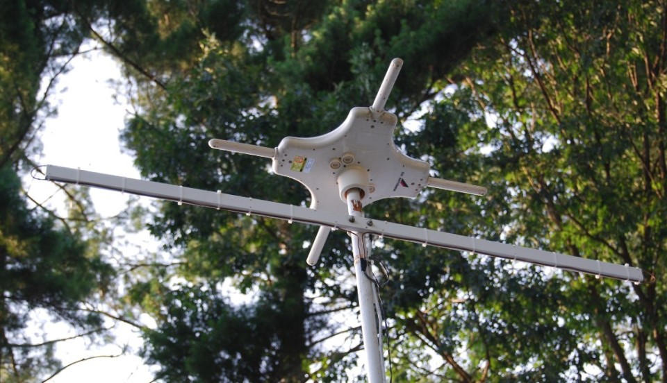 Detail of wire secured by cable ties, and the folded dipole mounted outdoors on a mast (below a DTV antenna).
